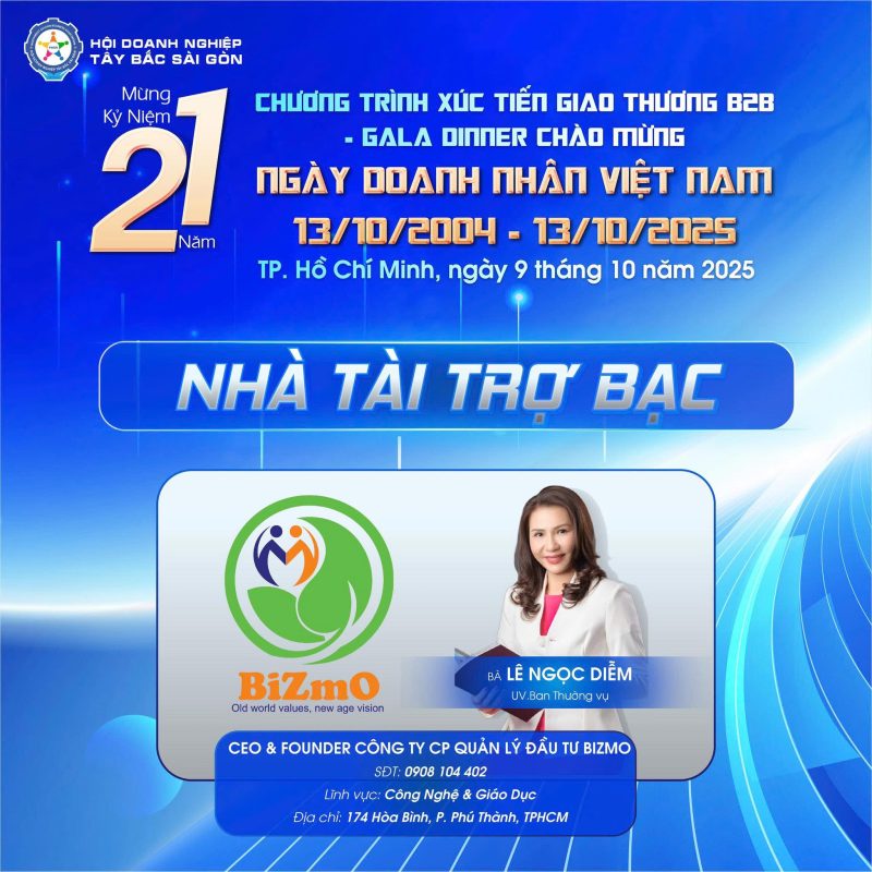 Nhân dịp kỷ niệm 21 năm Ngày Doanh nhân Việt Nam (13/10/2004 – 13/10/2025), Hội Doanh nghiệp Khu vực Tây Bắc Sài Gòn xin gửi lời tri ân chân thành và sâu sắc nhất tới Quý Công ty Bizmo – một đơn vị tiên phong, uy tín trong lĩnh vực quản lý đầu tư và cung cấp giải pháp chuyển đổi số, với đội ngũ chuyên gia giàu kinh nghiệm, luôn hỗ trợ doanh nghiệp đạt hiệu quả vượt trội và tạo ra giá trị bền vững. Sự đồng hành quý báu và những đóng góp thiết thực của Quý Công ty đã góp phần nâng tầm các hoạt động của Hội, tạo dựng uy tín, sức mạnh tổng thể và chất lượng bền vững cho cộng đồng doanh nghiệp trong khu vực.