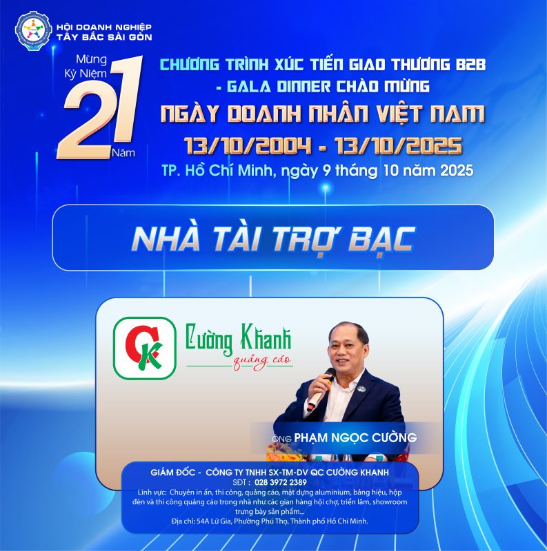 Trong hành trình 21 năm tôn vinh Ngày Doanh nhân Việt Nam (13/10/2004 – 13/10/2025), sự đồng hành, ủng hộ và sẻ chia của Quý Doanh nghiệp đã trở thành một phần quan trọng, góp thêm ngọn lửa nhiệt huyết để Chương trình được tổ chức thành công, ý nghĩa và lan tỏa những giá trị tốt đẹp đến cộng đồng doanh nghiệp.
